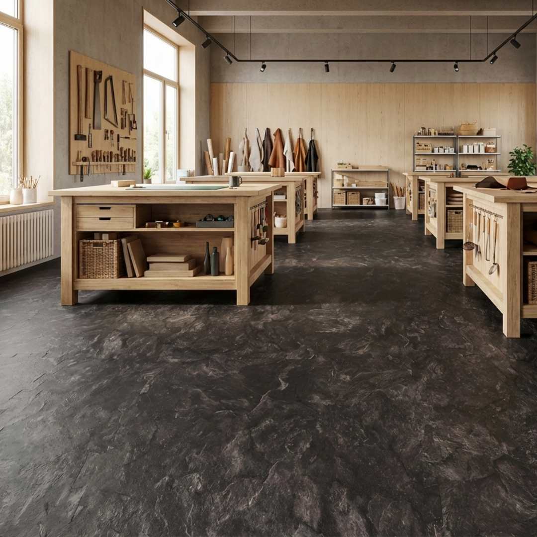 Modularer PVC-Objektboden in Steinoptik – ideal für Gewerbe, Industrie, Werkstätten, Garagenbereiche und stark frequentierte Flächen.