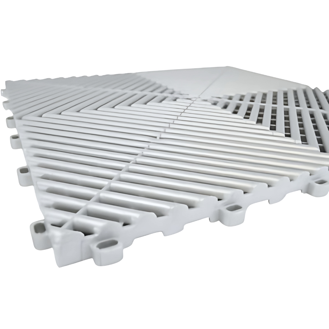 Die perforierte Gitterstruktur unterstützt die Luftzirkulation und leitet Feuchtigkeit sowie Schmutz nach unten ab – dadurch bleibt die Oberfläche optisch sauber und trockener.